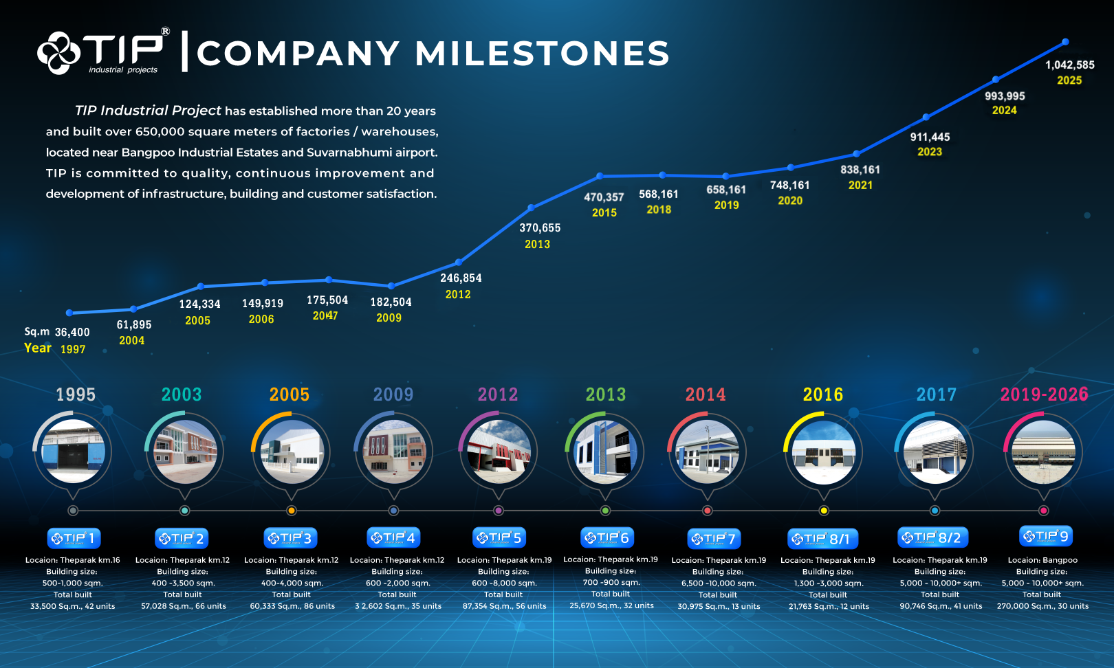โครงการ TIP อินดัลเทรียล ได้ก่อตั้งมาตั้งแต่ปี 1995 เป็นหนึ่งในผู้นำด้านพัฒนาอสังหาริมทรัพย์เพื่อกลุ่มอุตสาหกรรม เราประสบความสำเร็จในการก่อสร้างโรงงานและคลังสินค้ามากกว่า 1 ล้านตารางเมตรในจังหวัดสมุทรปราการ โดยมีขนาดตั้งแต่ 400 ถึงมากกว่า 10,000 ตารางเมตรต่ออาคาร เนื่องจากเราเป็นผู้ก่อสร้างอาคารเอง เราจึงสามารถเลือกใช้วัสดุและการออกแบบที่แข็งแรง รองรับการใช้งานภาคอุตสาหกรรมได้เป็นอย่างดี และการปรับรูปแบบให้ทันสมัย สวยงาม ด้วยคุณภาพในการก่อสร้างของเราเป็นที่ยอมรับระดับประเทศ เราจึงได้นำอสังหาริมทรัพย์บางส่วนของเราเข้าร่วมกับทรัสต์เพื่อการลงทุนในอสังหาริมทรัพย์และสิทธิการเช่าอสังหาริมทรัพย์เพื่ออุตสาหกรรม AIMIRT ในปี 2017และเข้าร่วมกับ FTREIT ของ Frasers ในปี 2023